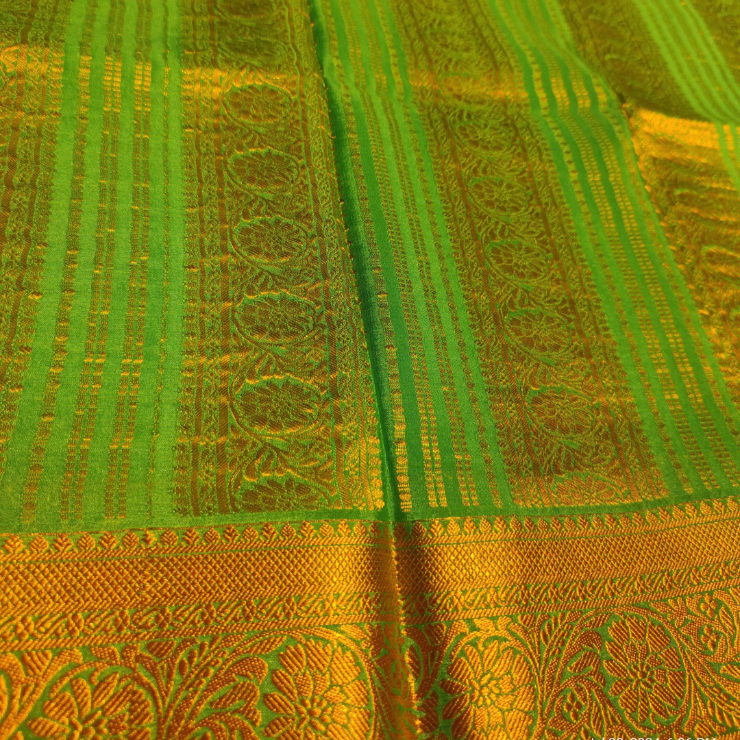 Sky Blue colour with 4 lines of golden Rudraksha borders. The pallu is the same colour as the saree and has simple gold vertical lines. A running blouse piece ( same design as saree) in included.