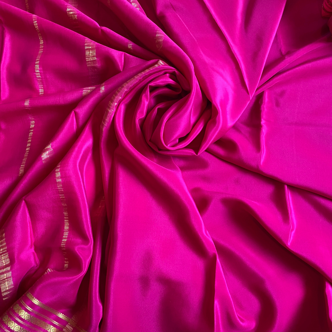 Rani Pink colour with 4 lines of golden Rudraksha borders. The pallu is the same colour as the saree and has simple gold vertical lines. A running blouse piece ( same design as saree) in included.
