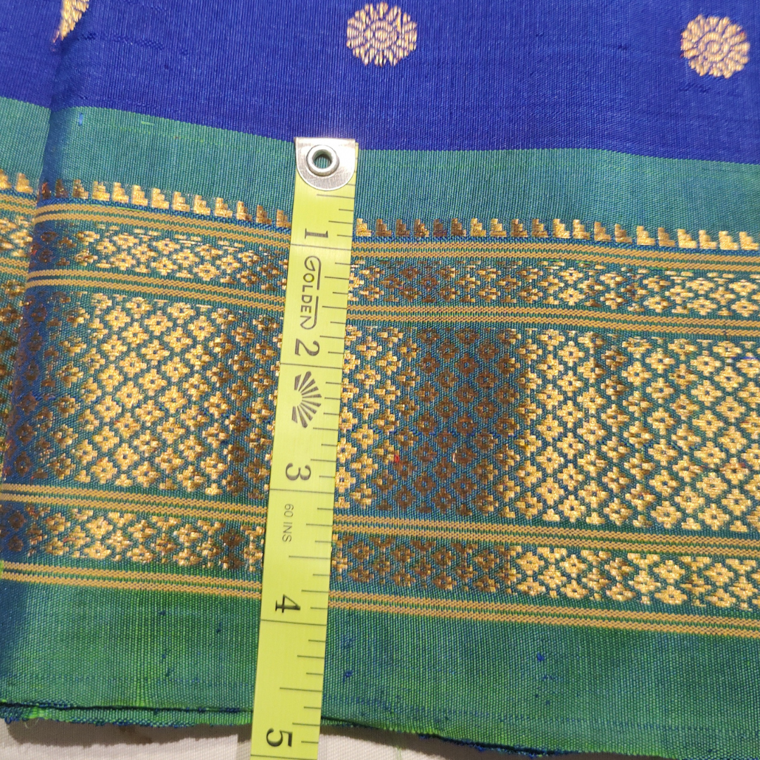 Sky Blue colour with 4 lines of golden Rudraksha borders. The pallu is the same colour as the saree and has simple gold vertical lines. A running blouse piece ( same design as saree) in included.